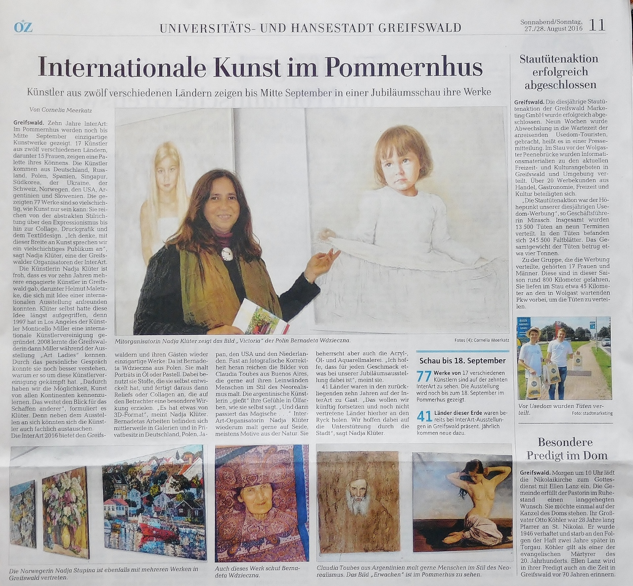 Ten years of InterArt: Unique works of art are exhibited until mid-September in Pommernhus. Seventeen artists, fifteen of which are women, from twelve different countries display all their skills. The artists come from Germany, Russia, Poland, Spain, Singapore, South Korea, Ukraine, Switzerland, Norway, United States, Argentina and Slovenia. The 77 works of art are as diverse as only art can be: from abstract style to expressionism, collage, prints and textile design. “I believe that with this artistic range we are reaching a very heterogeneous public” stated Nadja Klüter, one of the organizers of InterArt in Greifswald. The artist Nadja Klüter is happy that ten years ago there were so many artists committed to the idea of an international exhibition in Greifswald, amongst them, Helmut Maletzke. Klüter herself had grasped the idea long time before, as in 1997 the artist Monticello Miller had founded an international association of artists in Los Angeles. In 2008, Greifswald native Klüter had met Miller during the exhibition “Art Ladies”. Throughout their conversation she could better understand why the artist had fought so much for this association. “With it, we have the possibility to know art from other continents. This widens the spectrum for others´ creations.” added Klüter. Apart from everything concerning the exhibition, artists can share their technical knowledge.